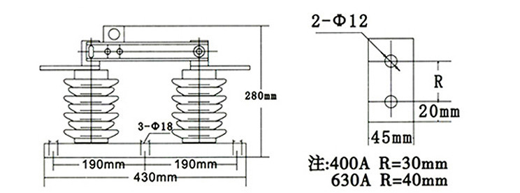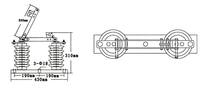 開關(guān)的額定電流有200、400、630、 800、1000安, 它們皆由底座、支柱絕緣子、導(dǎo)電部分和機(jī)構(gòu)部分組成。采用閘刀式結(jié)構(gòu)分合閘達(dá)到切斷和閉合線路。每相閘刀由兩片導(dǎo)電刀片組成,刀片兩側(cè)裝有壓縮彈簧,調(diào)節(jié)彈簧的高度可以得到開關(guān)閘刀所需要的接觸壓力。開關(guān)分合閘時用鉤棒操作機(jī)構(gòu)部分便可以進(jìn)行合閘運(yùn)動。閘刀有自鎖裝置。開關(guān)的外型見圖所示。