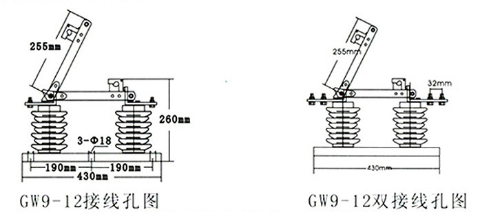 圖一GW9-12型隔離開關(guān)單、雙接線孔外型及安裝尺寸